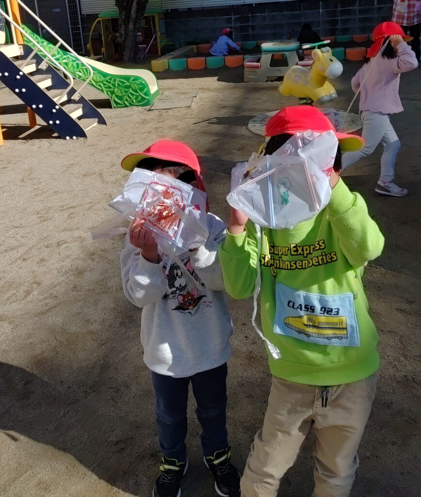 年中の子どもたちは自分で描いたオリジナルの凧を持って