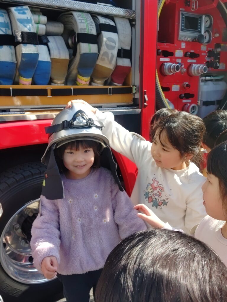 道具を見たり消防士さんの帽子をかぶせてもらったりして嬉しそうな子どもたちでした😊